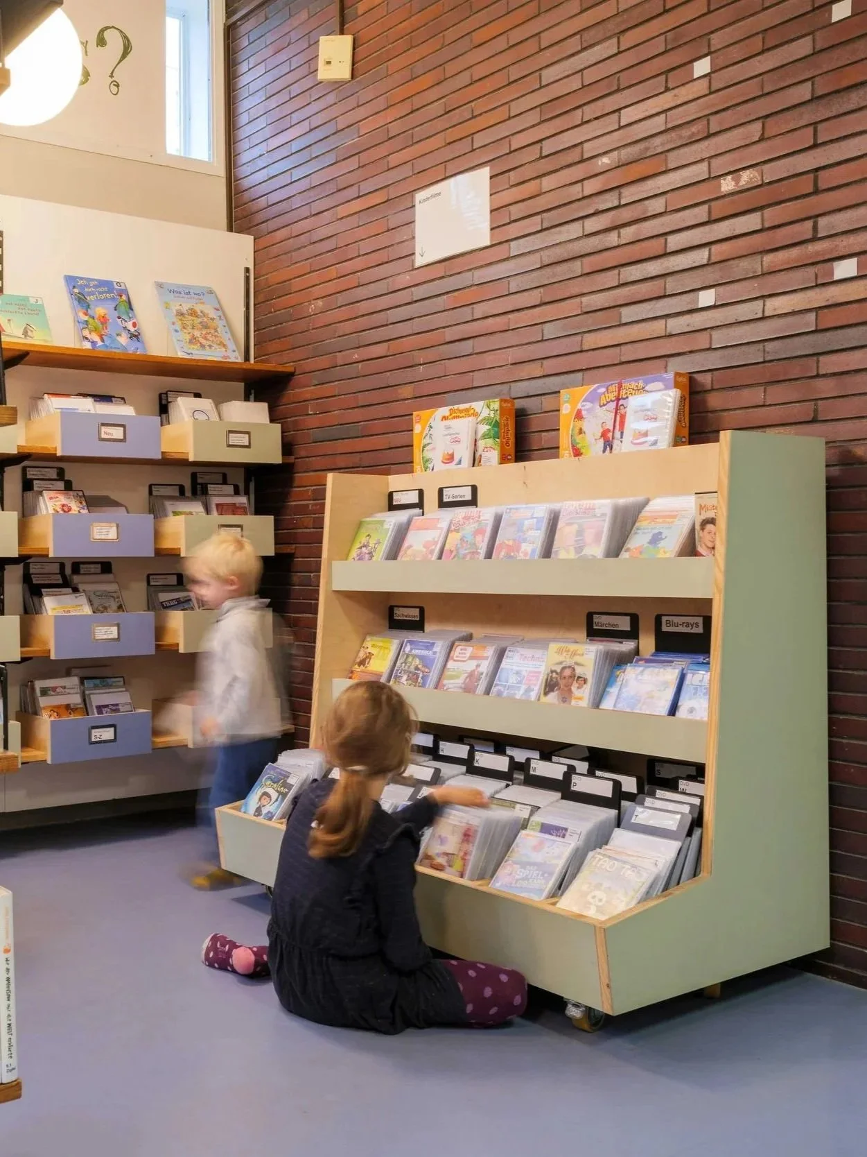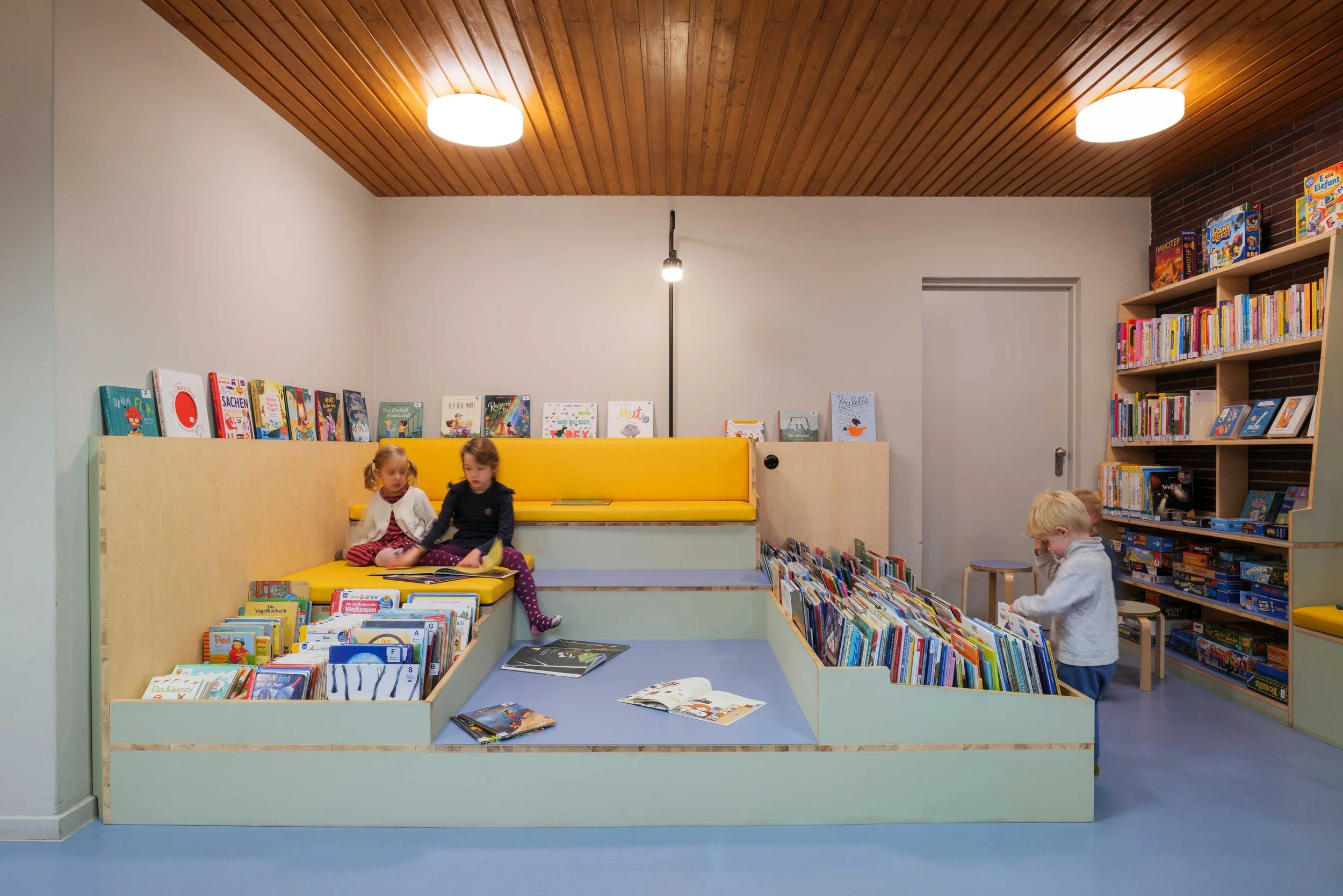 Die Kinder können sich nun auf einer Bücherlandschaft hinfläzen oder gespannt unter Laternenlicht einer Lesung lauschen. Auch Spieleboxen, DVDs und Tonnie-Träger haben neue Aufbewahrungskapazitäten und Präsentationsflächen erhalten und somit die Ansammlung von verschiedenen temporären Aufbewahrungsbehältern der letzten Jahr(zehnt)e abgelöst.