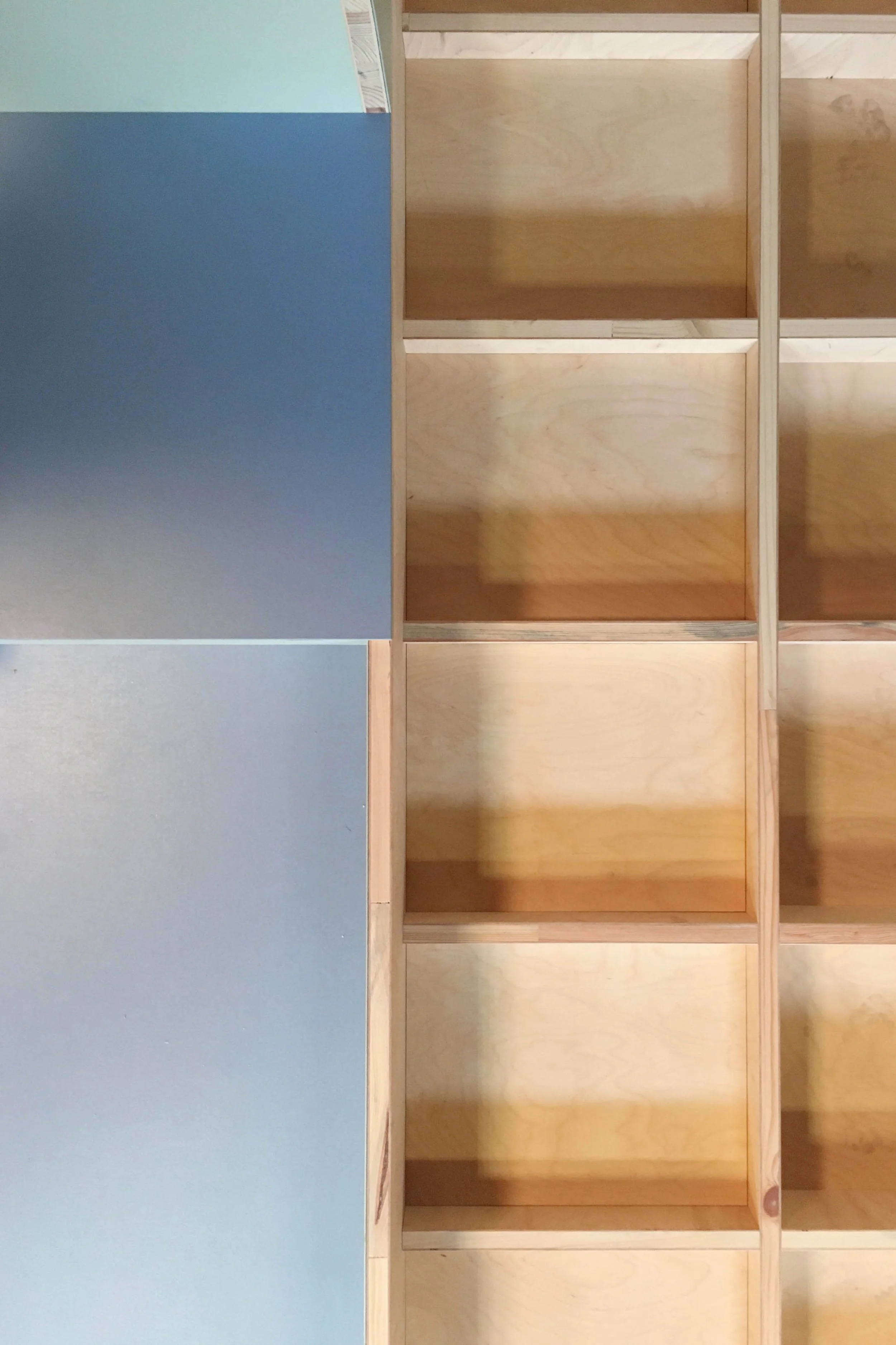 Die Form und Gestaltung aus Dreischichtplatten aus Erle, die teils mit Linoleum überzogen sind, nimmt die klare Formensprache des von Werner Düttmann entworfenen denkmalgeschützen Baus der Moderne aus dem Jahr 1957 auf. Die Schräge eines von Düttmann selbst gestalteten Möbelstücks für die Bibliothek findest sich wie selbstverständlich auch in den neu gestalteten Möbeln wieder.